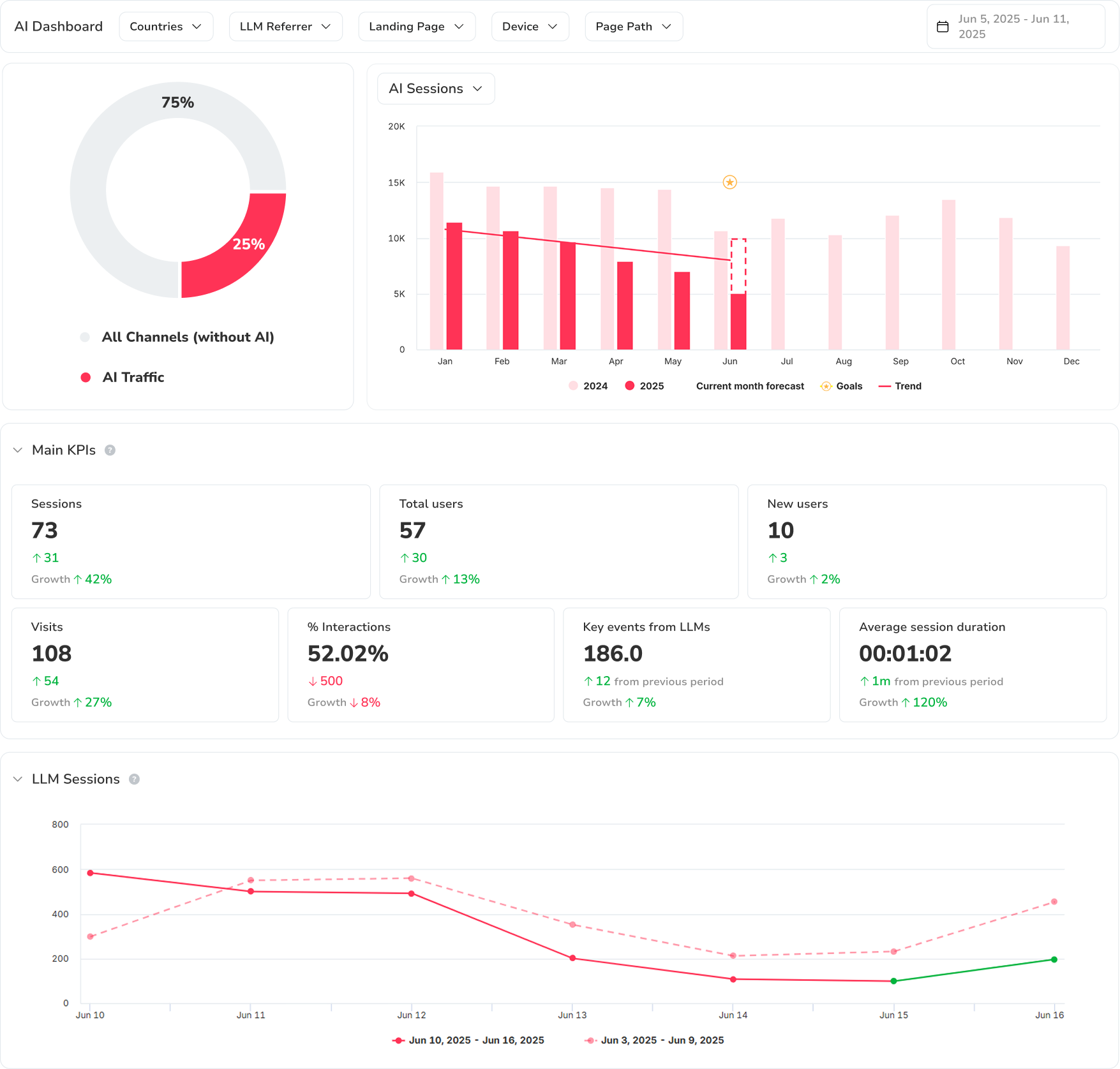 Analysiere jede KI-Traffic-Quelle im Detail: Sitzungen, durchschnittliche Besuchsdauer, generierte Ereignisse und Veränderungen über die Zeit. Ideal, um Aufwand dort zu priorisieren, wo das LLM den größten Business-Impact hat.