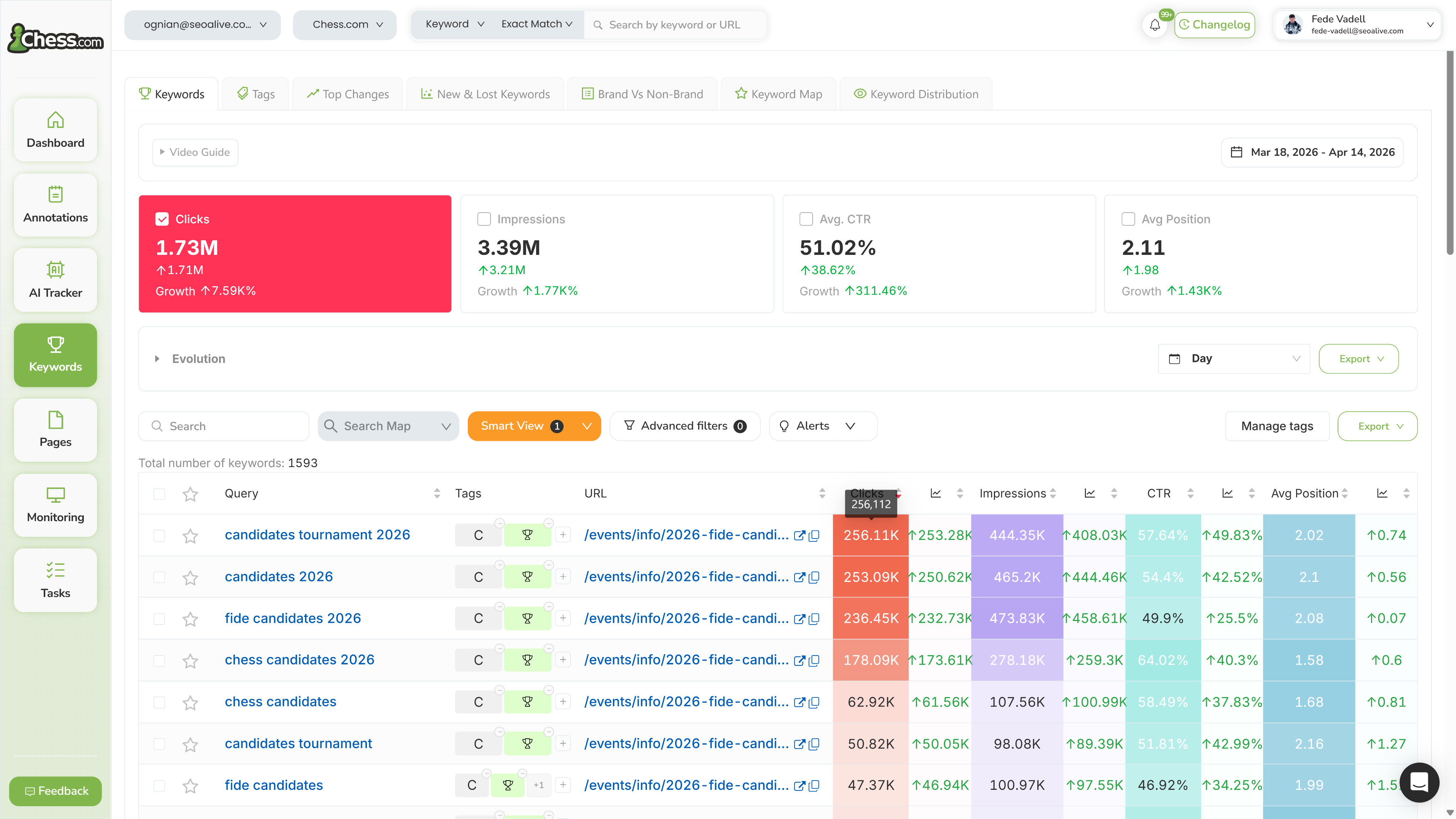 Überwache all deine Keywords, tagge sie und gruppiere sie in Clustern, analysiere sie mit Heatmaps und beobachte die Wachstumstrends jedes einzelnen Keywords. Zusätzlich kannst du Filter anwenden, um Branded- vs. Non-Branded-Traffic, Haupt-Keywords oder was auch immer du für sinnvoll hältst, zu sehen.