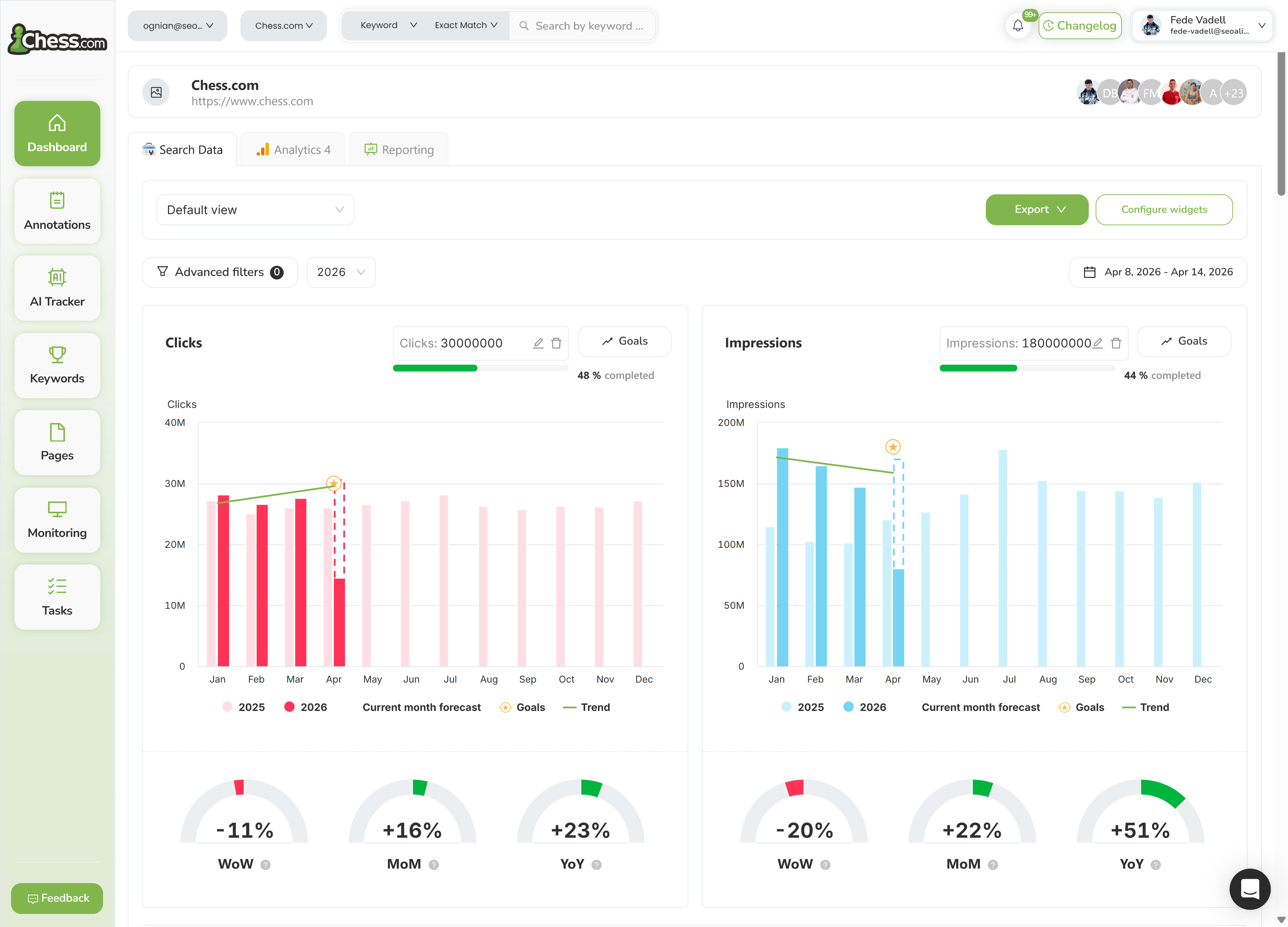 現在の日付に関係なく、特定の月のSEOパフォーマンスを予測します。月の5日、10日、15日の時点で、前月より良いパフォーマンスで月を終えられるか、それとも悪いかを確認できます。