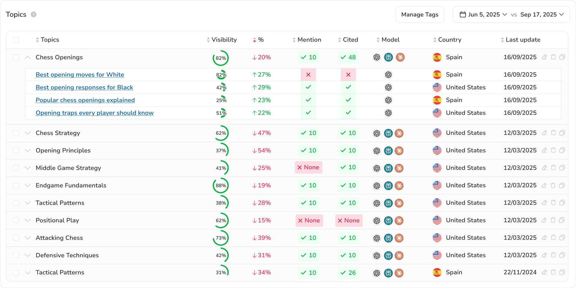 Filtruj według kraju, klastra tematycznego i modelu językowego, aby skupić się na segmencie, który ma znaczenie. Obserwuj, jak zmienia się Twoja widoczność na rynek, temat i model AI.
